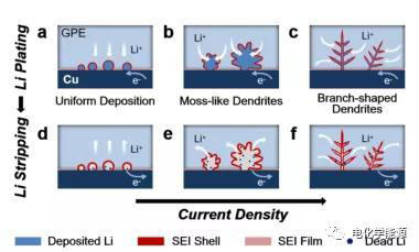 1)隨著電流密度的增加,均勻的鋰沉積逐漸演變?yōu)樘μ\狀和枝狀鋰枝晶。值得注意的是,Li枝晶上原位形成的固體電解質(zhì)界面(SEI)殼層在Li剝離后被明顯捕獲。