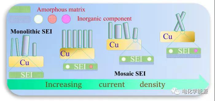 電流密度是控制鋰沉積形貌和固體電解質界面(SEI)的關鍵因素。然而,電流密度對Li沉積和SEI的原子級機制尚不清楚。太平洋西北國家實驗室Wu Xu, and Chongmin Wang等基于低溫透射電子顯微鏡(TEM)成像,結合能量色散X射線能譜(EDS)和電子能量損失譜(EELS)的電子結構分析,揭示了Li沉積形貌和SEI與電流密度的原子級關聯(lián)。他們發(fā)現(xiàn),電流密度的增加會導致鋰枝晶形核和生長的過電位增加,導致鋰枝晶從生長限制型向成核限制型轉變。與電流密度無關,電化學沉積的鋰金屬(EDLi)呈現(xiàn)晶須狀形貌。在低電流密度(0.1mA/cm2)下形成的SEI是整體非晶的;而高于2mA/cm2的電流密度則形成鑲嵌結構的SEI,其主要特征是具有Li2O和LiF分散體的非晶基體,并且SEI的厚度隨著電流密度的增加而增加。具體地說,Li2O粒子在空間上位于SEI的上表面,而LiF在空間上靠近Li-SEI界面。這些結果為通過改變沉積條件來調節(jié)EDLi和SEI的關鍵微觀結構和化學特性提供了可能的方法,從而與電池性能直接相關。