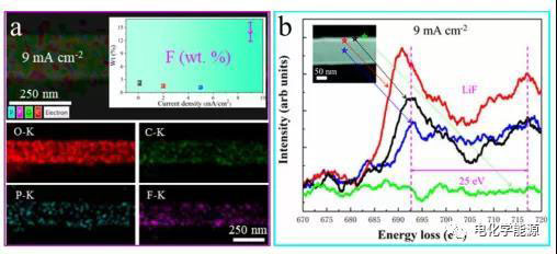 圖. 電解液中鋰金屬枝晶和SEI在電流密度為9ma-cm-2,時間為1.1min時的成分信息。(a)重疊的HAADF-STEM圖像和O-K、C-K、F-K和P-K的EDS圖譜顯示元素分布。插圖:F(wt%)隨電流密度的變化。(b) 66s電流密度為9ma cm-2時,枝晶和SEI的FK邊緣的精細結構比較。