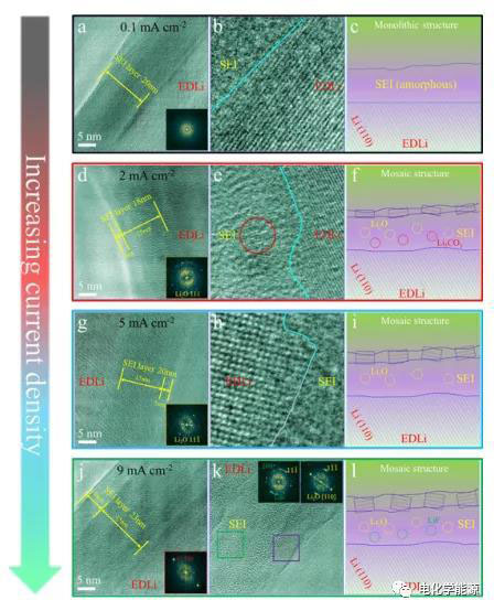 圖. 電流密度對SEI納米結構演化的影響。(a-c)SEI的原子分辨率TEM圖像,EDLi和SEI之間的界面結構,以及在Li上形成的觀察到的SEI示意圖,電流密度為0.1 mA cm-2,持續(xù)100 min;(d-f)2 mA cm-2,持續(xù)5 min;(g-i)5 mA cm-2,持續(xù)2 min;(j-l)9 mA cm-2,持續(xù)1.1 min。插圖:相應的FFT圖案。