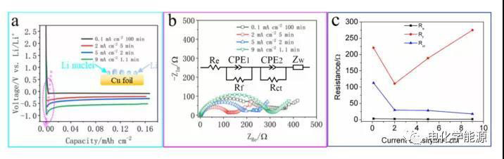 圖.不同電流密度下的電化學行為:(a) 在不同電流密度下,用Cu-TEM柵極上沉積鋰的實驗電壓分布。觀察到一個明顯的過電位,被粉紅色的橢圓圈起來。插圖顯示了鋰成核的原理,解釋了所涉及的額外能量。(b) 不同電解液中不同電流密度下鋰金屬鍍層阻抗譜變化的奈奎斯特圖比較。插圖是等效電路。Re為體電解液電阻,Rf為鈍化膜電阻,Rct為電荷轉移電阻,CPE為恒相元件,Zw為Warbug阻抗。(c) 體電解液電阻(Re)、鈍化膜電阻(Rf)和電荷轉移電阻(Rct)隨電流密度的變化而變化。