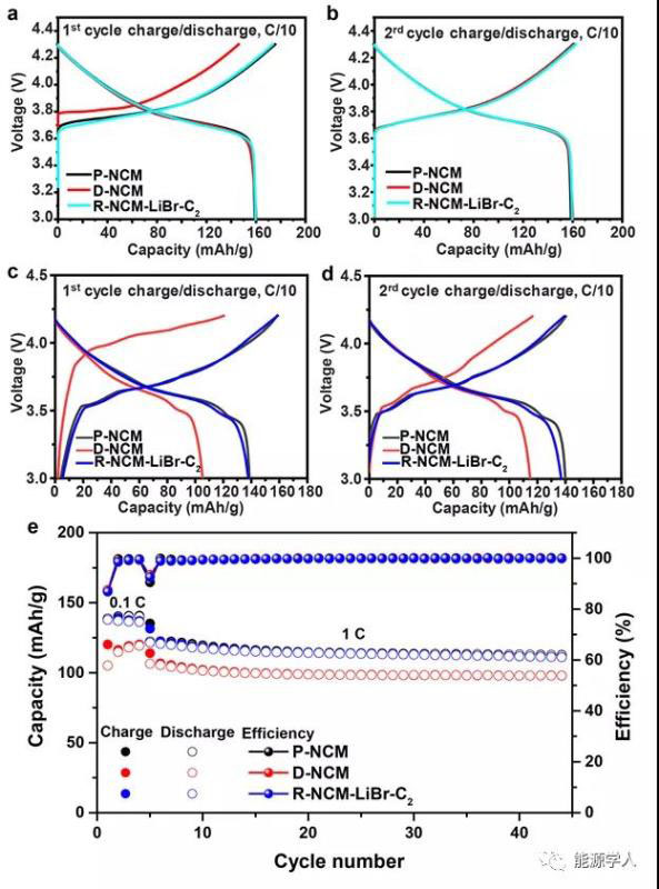 將離子熱鋰化后的產(chǎn)物用作正極材料,以鋰片為負(fù)極組成半電池測試時(shí),脫鋰的D-NCM首圈充電容量顯著低于P-NCM, 鋰化產(chǎn)物R-NCM-LiBr-C2的首圈充放電曲線幾乎與P-NCM重合,證明其容量得到了修復(fù)(圖2 a)。由于半電池測試中,鋰負(fù)極可以提供充足的鋰源,因此可以看到D-NCM的首圈放電容量也得到了提升,這是電化學(xué)鋰化過程導(dǎo)致的。在實(shí)際應(yīng)用中,石墨負(fù)極并不能提供額外的鋰,因此,全電池測試可以更好的體現(xiàn)電極回收利用的效果。如圖2c所示,全電池測試中,R-NCM-LiBr-C2依然表現(xiàn)出媲美P-NCM的性能,而D-NCM表現(xiàn)出明顯較低的容量。在循環(huán)測試中,R-NCM-LiBr-C2與P-NCM的穩(wěn)定性相當(dāng)。因此,離子熱鋰化過程可以修復(fù)廢舊正極材料的容量。