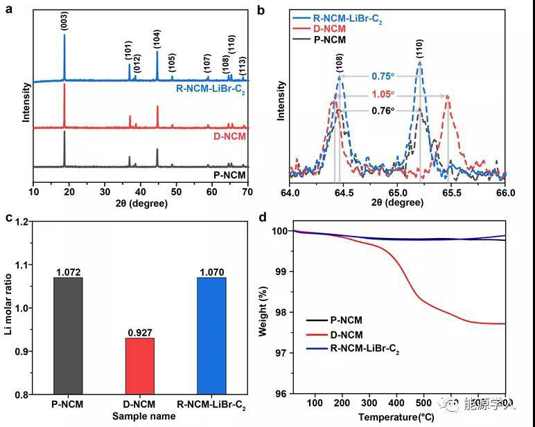 圖1. a) P-NCM,D-NCM和R-NCM-LiBr-C2的XRD圖;b) 局部放大的XRD圖;c) 基于ICP結(jié)果計(jì)算的Li元素含量;d) 空氣下三種材料的熱重曲線。