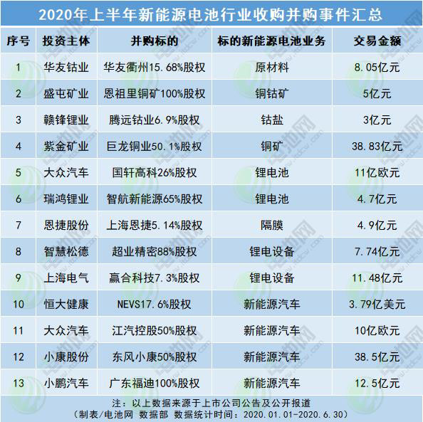 據(jù)電池網(wǎng)(微號:mybattery)粗略統(tǒng)計,今年上半年電池新能源產(chǎn)業(yè)鏈重組項目有13個,其中,礦產(chǎn)及原材料項目4個,鋰電池項目2個,隔膜項目1個,鋰電設備項目2個,新能源汽車項目4個,交易總金額約328.13億元。