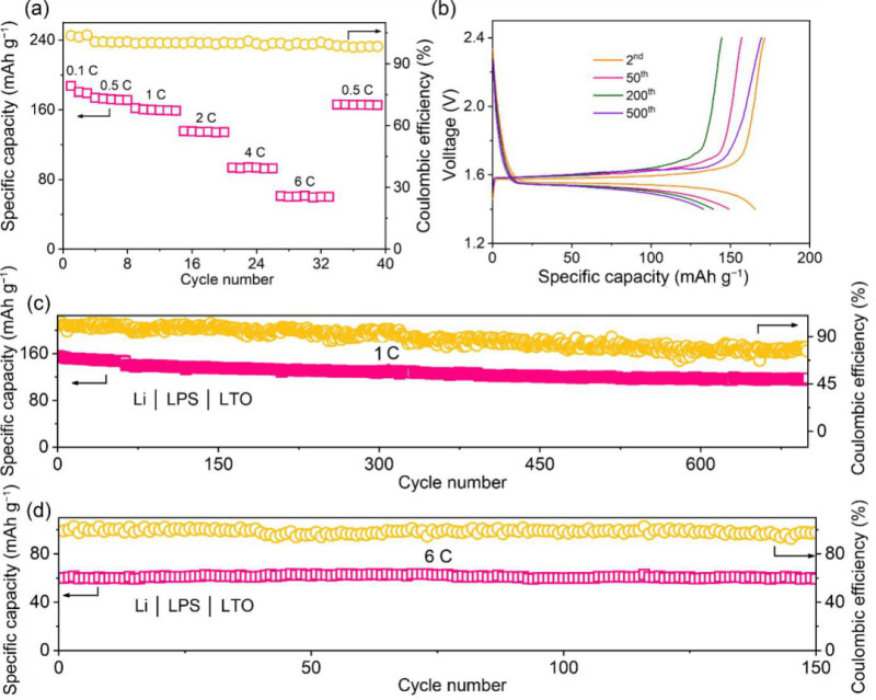 Li | LPS | LTO 固態(tài)電池在1.4–2.4 V的充放電窗口下的(a)倍率性能,(b)充放電曲線,(c) 1 C長循環(huán)及(d) 6 C長循環(huán)。
