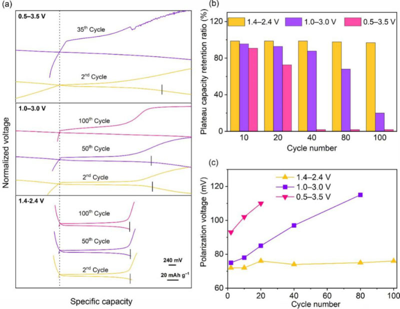 (a) Li | LPS | LTO 固態(tài)電池在不同充放電窗口及循環(huán)圈數(shù)下的平臺容量,20 mAh g–1的標(biāo)尺對應(yīng)橫坐標(biāo),240 mV的標(biāo)尺對應(yīng)縱坐標(biāo)。(b)固態(tài)電池中LTO在不同充放電窗口及循環(huán)圈數(shù)下的容量保持率。(c) Li | LPS | LTO 固態(tài)電池在不同充放電窗口下的電池極化隨著電池循環(huán)圈數(shù)的變化。