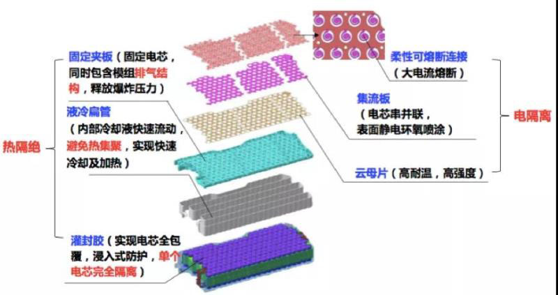 第二層級:模組,通過模組電隔離與熱隔絕方案實(shí)現(xiàn)單個電芯爆噴后能量釋放受控;