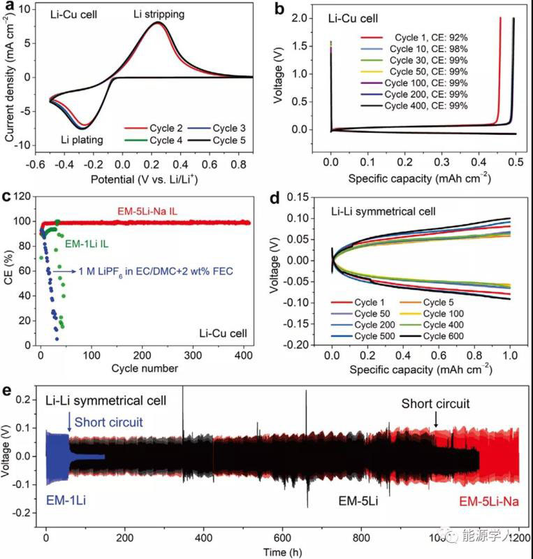 圖2 不同離子液體電解液的電化學(xué)性能。a)采用 EM-5Li-Na IL電解液的Li-Cu電池的CV曲線,掃描速率為2mvs?1。b) 使用EM-5Li-NaIL電解液的Li-Cu電池進(jìn)行Li沉積/溶解時(shí)的充放電曲線。c)分別采用傳統(tǒng)有機(jī)電解液、EM-1Li和EM-5Li-Na IL電解液時(shí)Li-Cu電池中Li沉積/溶解的庫侖效率。(b,c)中電流密度和面積比容量分別為0.5 mA cm?2和0.5 mAh cm?2。d)使用EM-5Li-Na IL電解液的Li/Li對稱電池在不同循環(huán)次數(shù)下的Li沉積/溶解曲線。e)分別采用EM-1Li、EM-5Li和EM-5Li-Na IL電解液時(shí)Li /Li對稱電池的Li沉積/溶解曲線。(e,f)中電流密度和面積比容量分別為1 mA cm?2和1 mAh cm?2。