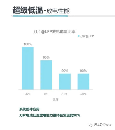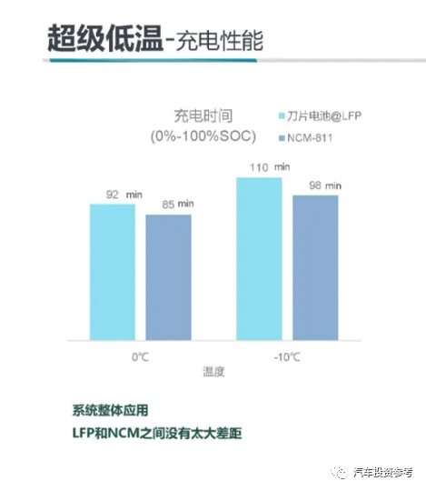 在-10℃的環(huán)境下,刀片電池能夠在110分鐘內(nèi)從0充電至100%。同等情況下,NCM電池需要98分鐘。