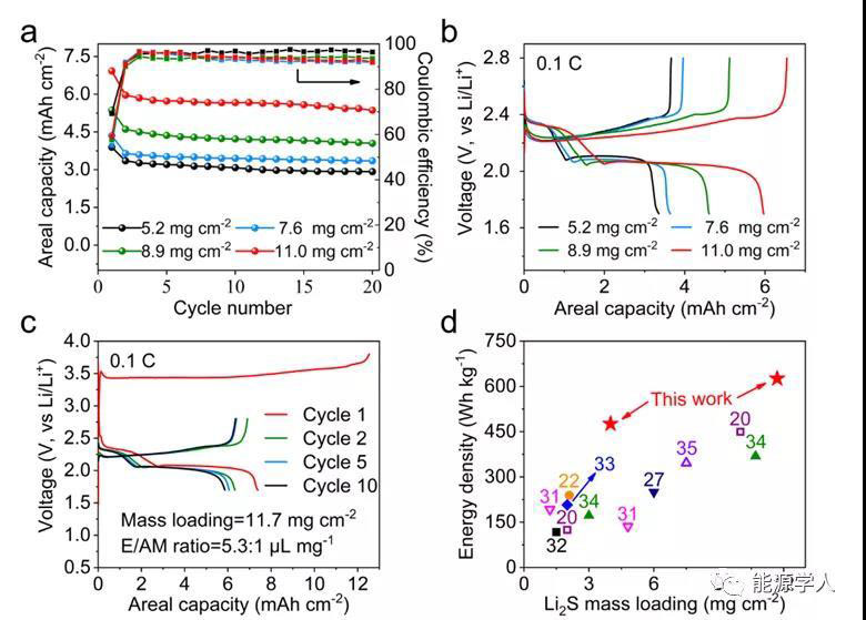 圖6進(jìn)一步驗(yàn)證了Li2S||Au/Cu全電池的應(yīng)用潛力。分別測(cè)試了載量達(dá)到5.2,7.6, 8.9, 11.0 mg cm-2情況下的循環(huán)性能。另外,載量進(jìn)一步達(dá)到11.7mg cm-2且控制電解液的含量為5.3 μL mg-1 的循環(huán)性能也進(jìn)行了測(cè)試。在此條件下,電池的能量密度達(dá)到了626Wh kg-1(考慮電極中含有的所有物質(zhì))。