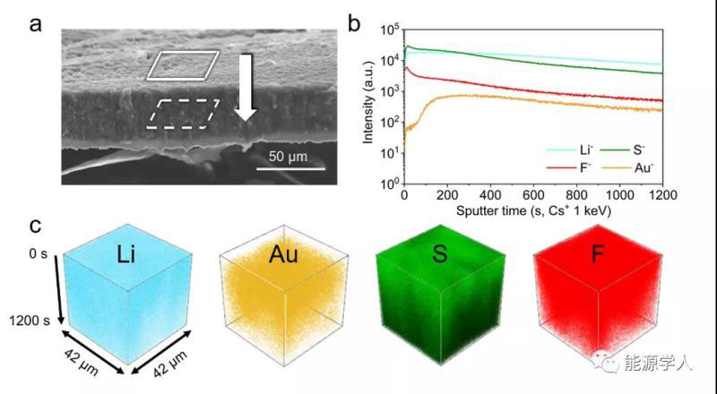 圖4.(a)首圈充電鋰沉積的截面SEM圖像;(b)Li-、S-、F-、Au-粒子的飛行時(shí)間-二次離子質(zhì)譜的深度曲線;(c)相應(yīng)粒子的三維圖像。