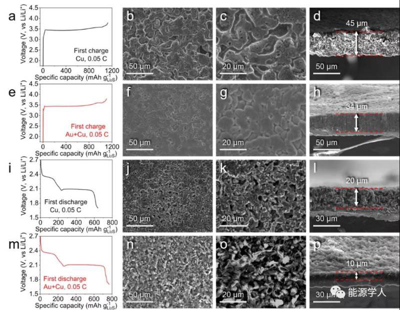 圖3. Li2S||Cu和Li2S||Au/Cu全電池的首圈充放電曲線及其負(fù)極的SEM圖像。