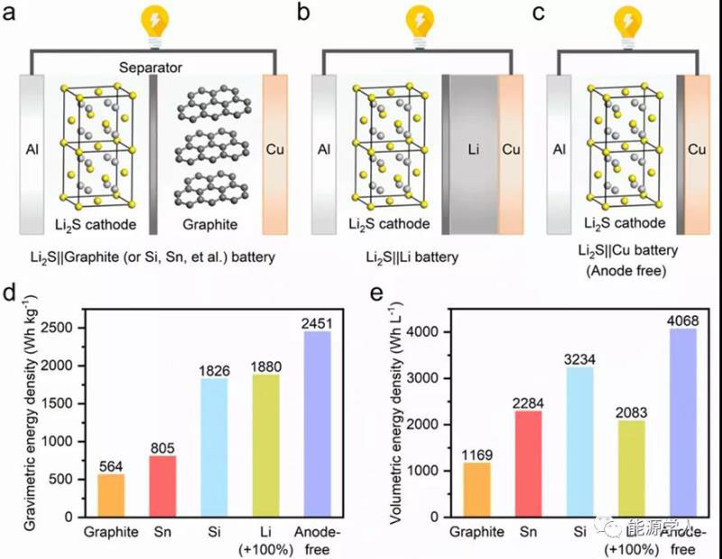 圖1.(a-c)Li2S||石墨 (或者 Si, Sn, 等),Li2S||Li,Li2S||Cu(無鋰負(fù)極)全電池示意圖;(d-e)Li2S||石墨、Li2S||Sn、Li2S||Si、Li2S||Li(+100%)和Li2S||無鋰負(fù)極全電池的理論質(zhì)量能量密度和體積能密度。