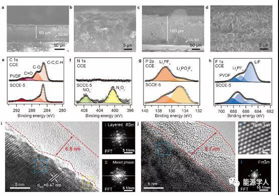 圖6. 碳酸酯電解液對正負極的界面化學研究。(a-d)在增溶劑介導的碳酸酯電解液(a-b)和傳統(tǒng)碳酸酯電解液(c-d)中超薄鋰負極30圈循環(huán)形貌。(e-j)增溶劑介導的碳酸酯電解液形成的CEI組分分析。