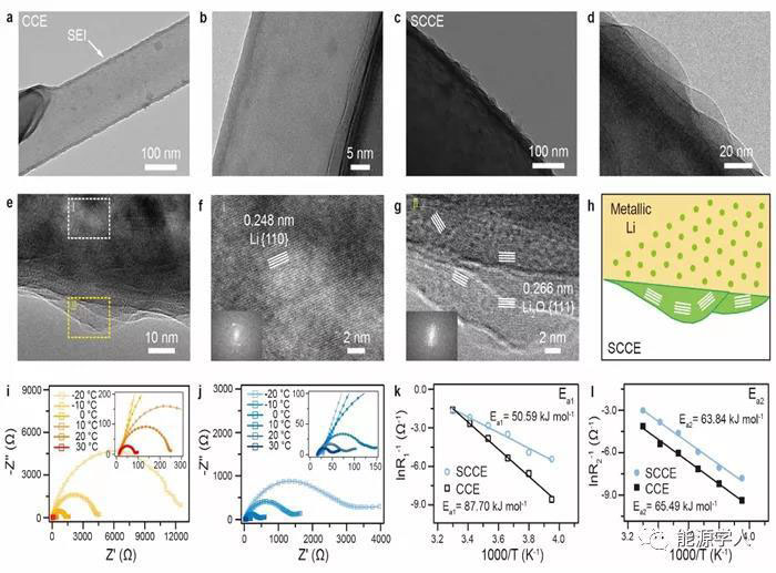圖 4. 增溶劑介導的碳酸酯電解液誘導的納米波浪狀SEI結構。(a-b)傳統(tǒng)碳酸酯電解液中枝晶狀沉積與無定型SEI的冷凍電鏡圖。(c-h)增溶劑介導的碳酸酯電解液中,大塊狀沉積與富含無機組分的波浪狀SEI的冷凍電鏡圖。(i-l)SEI層以及去溶劑化活化能壘差異。
