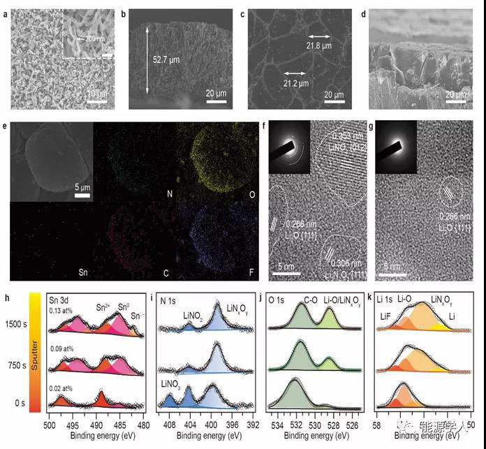圖 3. 增溶劑介導的碳酸酯電解液中鋰金屬沉積。(a-d)在傳統(tǒng)碳酸酯電解液(a-b)和增溶劑介導的碳酸酯電解液(c-d)中的沉積形貌(面容量5 mA h cm-2)對比。(e)鋰金屬沉積SEM和EDS mapping。(f-g)增溶劑介導的碳酸酯電解液(f)和傳統(tǒng)碳酸酯電解液(g)中SEI的HRTEM圖。(h-k) 增溶劑介導碳酸酯電解液誘導下SEI的XPS Sn 3d, N 1s, O 1s and Li 1s不同深度組分分析。