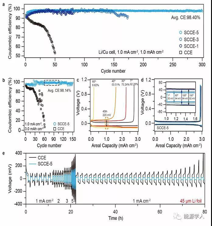 圖 2. 鋰金屬負極高效沉積/剝離。(a-d)Li/Cu電池中鋰金屬庫倫效率測試,面容量:1 mA h cm?2(a);3 mA h cm?2(b-d)。(e)使用45μm超薄鋰金屬負極的對稱電池倍率性能測試。