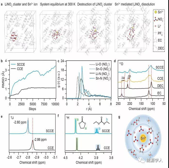 圖1. 增溶劑介導的碳酸酯電解液中的配位-溶劑化結構。(a) AIMD模擬硝酸鋰在增溶劑作用下的溶解過程。(b)硝酸根離子簇RMSD變化。(c)Li+-NO3-和Sn2+- NO3-在1 M LiPF6 EC/DEC中的RDF。(d-f)電解液17O,7Li和1H核磁譜圖。(g)增溶劑介導的碳酸酯電解液中溶劑化結構示意圖。