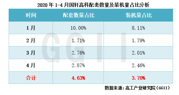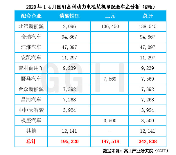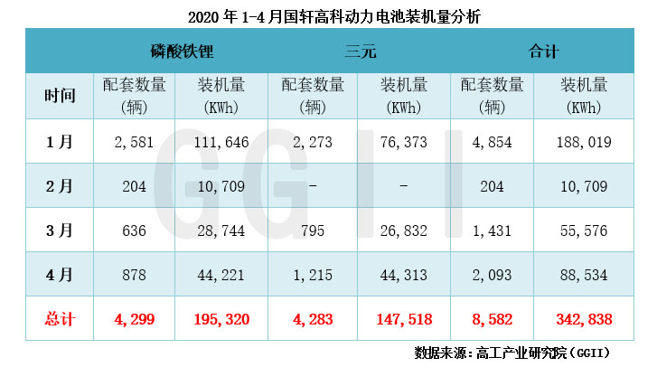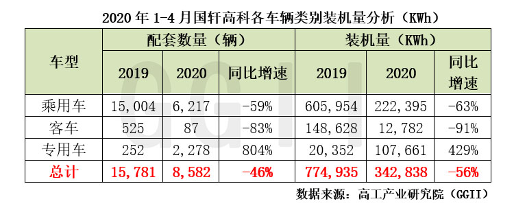 高工產(chǎn)業(yè)研究院(GGII)通過發(fā)布的《動力電池月度數(shù)據(jù)庫》統(tǒng)計顯示,2020年1-4月國軒高科合計配套新能源汽車8,582輛,同比下降46%,動力電池裝機量合計約0.34GWh,同比下降56%。其中,三元動力電池合計配套新能源汽車4,283輛,同比增長111%,裝機量合計約0.15GWh,同比增長90%;磷酸鐵鋰動力電池合計配套新能源汽車4,299輛,同比下降69%,裝機量合計約0.19GWh,同比下降72%。