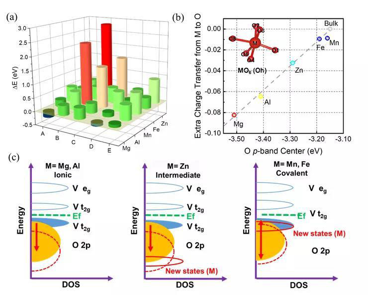 對兩種摻雜位點下結(jié)構的電子結(jié)構進行第一性原理計算,并引入氧的p帶中心作為材料在鋰離子脫嵌過程穩(wěn)定性的判斷標準。研究表明,Mg摻雜對電子導電性的影響較小,而V位摻雜會一定程度改善鋰離子遷移速率,并且造成氧的p帶中心負移,保證了高電位下過渡金屬氧化還原的穩(wěn)定性。隨后,我們將這種那個Mg摻雜行為的規(guī)律推廣到其他常見的金屬離子,如Al、Mn、Fe和Zn,并詳細討論了摻雜體系電子、離子的輸運行為、結(jié)構穩(wěn)定性的判斷依據(jù)等,為后續(xù)相似工作的開展提供了參考。