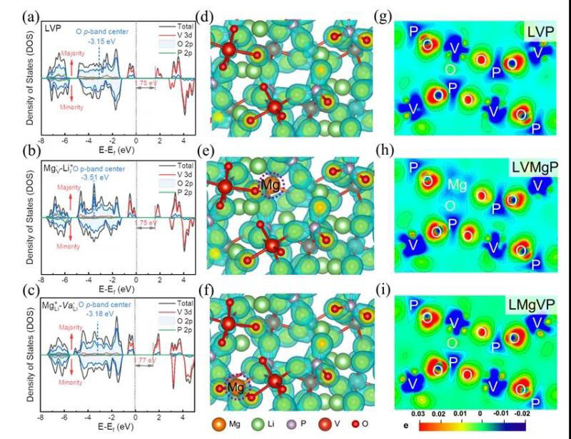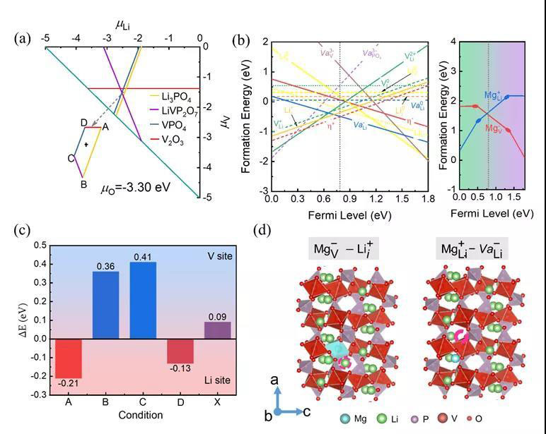 在磷酸釩鋰本征缺陷的研究的基礎上,進一步預測了不同金屬離子的摻雜行為,包括其摻雜位點及其對應缺陷形成能、電荷補償機制。特別地,對于Mg摻雜的情況,Li、V為摻雜在能量上均是可行的,而為了保持電荷平衡,體系通過引入額外的原子(空位)來抵消摻雜劑的等效電荷,而不是極化子的形成。這樣的結(jié)果從理論上表明,可以通過控制合成過程中Li,V和Mg的相對豐度來調(diào)整Mg的晶格位點偏好。