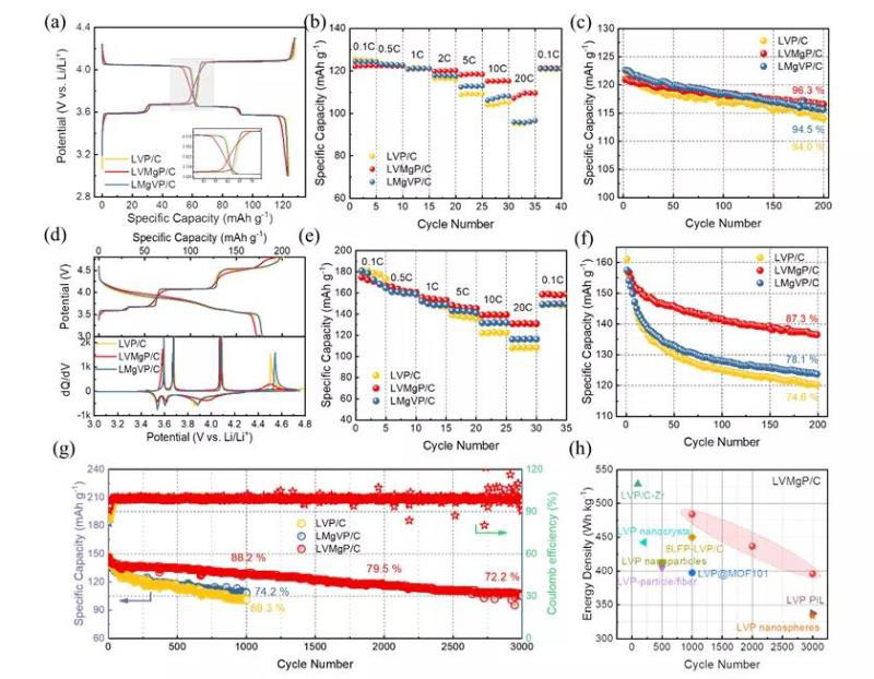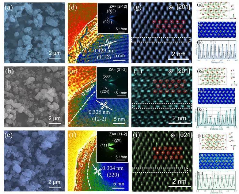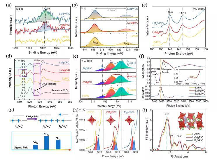 通過采用包括XPS、XAS在內(nèi)的光譜學手段和SEM、TEM在內(nèi)的電子顯微學手段,對不同位點Mg摻雜磷酸釩鋰的結(jié)構進行了深入分析。結(jié)果表明,V位摻雜會造成V-O多面體對稱性增強,晶胞體積具有擴大的趨勢,而Li位摻雜對本體結(jié)構的影響較小。