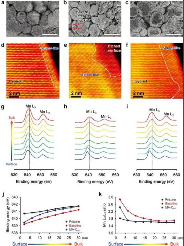為了揭示MA-C60在富鋰正極在原子尺度分辨率下的界面穩(wěn)定性中的作用,進行了STEM和EELS。富鋰正極的電壓衰減有兩個主要原因,導(dǎo)致電池的能量密度降低:易變的CEI結(jié)構(gòu)以及不利的相變。如圖4d–f中的STEM圖像所示,在基準(zhǔn)電解液中富鋰正極表面尖晶石層較厚。與在之形成鮮明對比的是,在具有MA-C60富鋰正極的循環(huán)表面上出現(xiàn)了3 nm的較薄的層狀至尖晶石相變層。不可重復(fù)的相變極大地影響了富鋰正極在重復(fù)充電和放電后的電壓衰減變化。EELS清楚地表明,MA-C60衍生的CEI減輕了富鋰正極的相變(圖4g-k)。當(dāng)富鋰正極具在基準(zhǔn)電解液時,其Mn L邊緣會從本體向表面移動,向低能量方向發(fā)生化學(xué)位移(圖4h)。與初始正極相比,富鋰正極的Mn L3峰位置即使在距表面30 nm的深度處也相差約0.5 eV,這表明在主體中部分發(fā)生了不可逆相變(圖4j)。相反,相對于初始正極,MA-C60的添加逐漸降低了Mn L3峰結(jié)合能的差異。Mn的價態(tài)僅在5 nm的薄表面層中發(fā)生了變化,并且?guī)в蠱A-C60的塊狀富鋰正極的Mn L3/L2的強度比與初始正極的強度比相似(圖4k)。