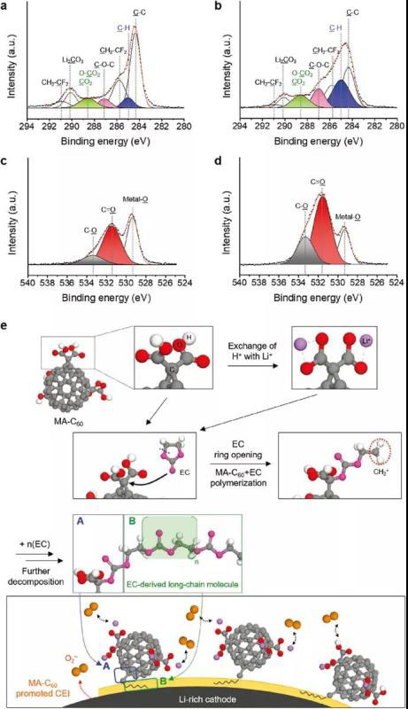 XPS結(jié)果顯示了在有和沒有MA-C60的電解液中預(yù)循環(huán)的富鋰正極的不同表面化學(xué)性質(zhì)。C 1sXPS數(shù)據(jù)表明,MA-C60導(dǎo)致形成了含量相對較高的C=O(–CO2,–O–CO2、288.6eV),C–O(287.1 eV)和C–H(285 eV)(圖3a,b)的CEI。O 1s XPS光譜進一步證實了CEI中C=O和C–O物質(zhì)的富集(圖3c,d)??紤]到MA-C60促進的CEI的形成始于4 V vs. Li/Li+的電位,隨后形成超氧化物自由基(4.5 V vs. Li/Li+),我們預(yù)期C=O和C–O的富集起源于MA-C60和EC的反應(yīng)組成(圖3e)。與富勒烯化學(xué)鍵合的MA通過失去電子而氧化,從而在初始充電時在富鋰上產(chǎn)生反應(yīng)性陽離子自由基。在C60表面形成的陽離子自由基觸發(fā)EC分子的開環(huán),MA-C60和EC的組合導(dǎo)致長鏈有機物在富鋰正極上的積累。因此,構(gòu)建了具有來源于EC的長鏈分子的MA-C60促進的CEI。