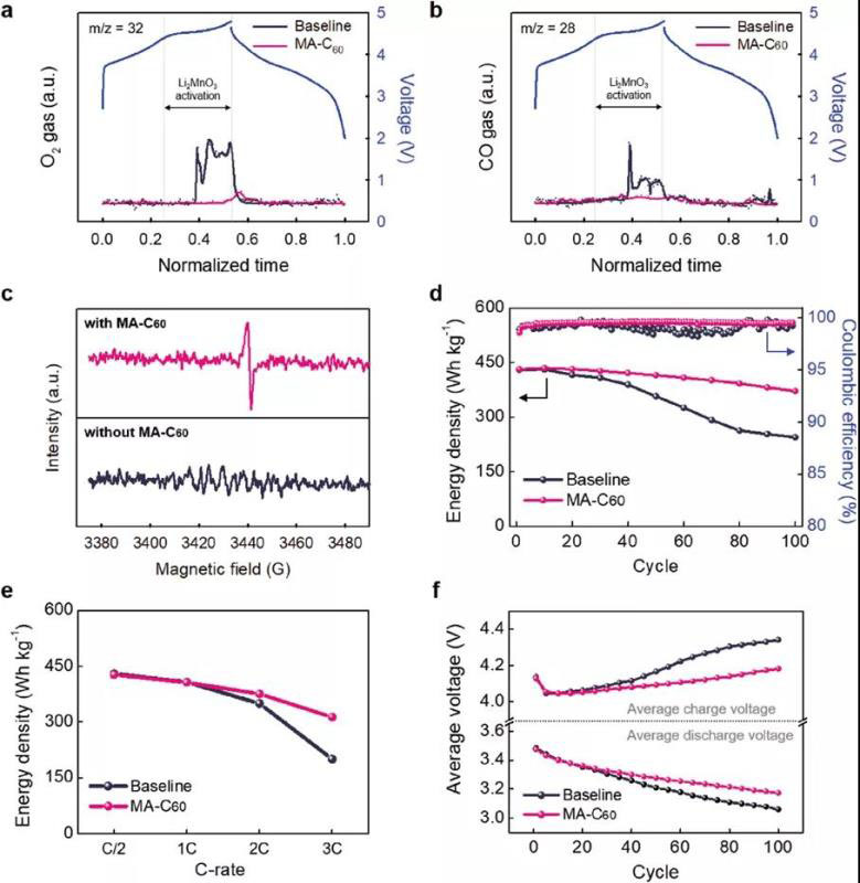 與基準(zhǔn)電解液相比,MA-C60添加劑的使用顯著降低了Li2MnO3活化過程產(chǎn)生的O2,CO和CO2氣體量(圖2a,b)。包含MA-C60的電池中O2,CO和CO2氣體的減少歸因于MA-C60清除超氧自由基的獨特能力。如圖1b的示意圖所示,吸附在MA-C60上的兩個超氧化物自由基分子可借助Li+靜電鍵合到丙二酸基團的羧酸鹽上,促進Li2O2的形成。