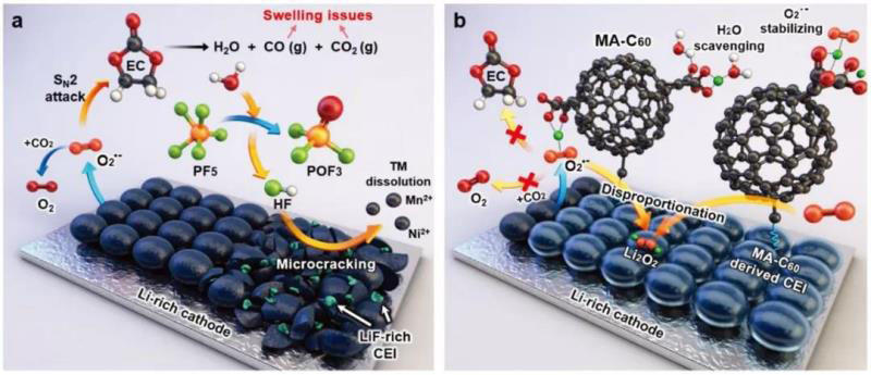 圖1. 富鋰正極的衰減和MA-C60添加劑作為反應(yīng)性清除劑和界面改性劑保護富鋰正極的示意圖。