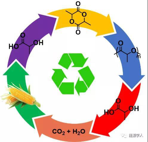為保護生態(tài),目前工業(yè)上對于化工產(chǎn)品的綠色循環(huán)利用十分重視。脂肪族聚碳酸酯與聚酯作為常見的可生物降解材料,將其應(yīng)用到固態(tài)鋰電池中,對于鋰電池的綠色循環(huán)意義顯著。如聚乳酸(PLA)是一種最常見的可生物降解的高分子材料,其通常由丙交酯開環(huán)聚合而成,而丙交酯可通過玉米、小麥等通過發(fā)酵生成的乳酸通過環(huán)化反應(yīng)制備,PLA也可在酶的催化作用下最終降解為CO2和水,回到自然界。其綠色循環(huán)途徑如圖6所示。