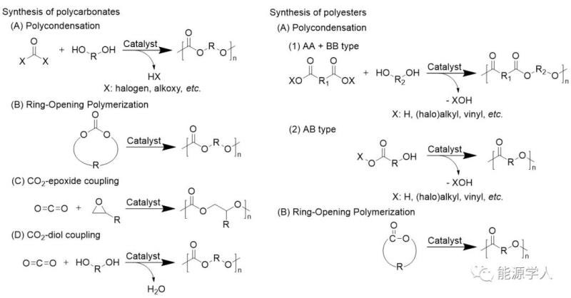 脂肪族聚碳酸酯的合成主要有四種策略:縮聚、開環(huán)聚合、CO2-環(huán)氧偶聯(lián)聚合與CO2-二醇偶聯(lián)聚合(如圖5所示)。其中最吸引人注意的是采用CO2作為原料進行的偶聯(lián)聚合,該聚合是一種環(huán)境友好型聚合反應(yīng),其原料為溫室氣體CO2,對于環(huán)境保護具有非常重要的意義,但該類反應(yīng)仍需進一步優(yōu)化,研究開發(fā)高效的催化劑以提高反應(yīng)效率并降低副反應(yīng)。而脂肪族聚酯的合成通常有兩種辦法:縮聚和開環(huán)聚合。其中縮聚主要包括AA+BB型的雙單體聚合體系與AB型單一單體聚合體系。由于聚碳酸酯與聚酯的化學(xué)結(jié)構(gòu)在一定程度上相似,因此它們的很多催化劑可以通用。特別地,對于脂肪族聚碳酸酯和聚酯,某些特定種類的酶對于其合成和降解具有顯著的催化效果,因而可能實現(xiàn)固態(tài)電池中SPE材料的綠色合成和電池材料的綠色循環(huán)利用。