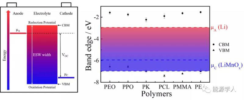 羰基配位SPE在離子電導(dǎo)率、鋰離子遷移數(shù)和電化學(xué)穩(wěn)定窗口方面較聚醚類SPE具有顯著的優(yōu)勢。這是因為聚醚類SPE的醚氧與鋰離子配位形成Li-O鍵較穩(wěn)定,難以斷開而導(dǎo)致離子電導(dǎo)率較低、鋰離子遷移數(shù)??;聚醚類聚合物(如PEO)的較高結(jié)晶性也限制了其室溫離子電導(dǎo)率;此外,聚醚的HOMO能級較高,因而氧化電位低,電化學(xué)穩(wěn)定性較差。而羰基配位SPE(主要為脂肪族聚酯和聚碳酸酯類)的羰基氧和鋰離子配位后,較容易斷裂解離,因而該類SPE具備較高的離子電導(dǎo)率和鋰離子遷移數(shù);該類SPE在高鋰鹽濃度條件下,多余的鋰鹽由于增塑作用可顯著降低聚合物的玻璃化溫度,因而提高其室溫離子電導(dǎo)率至10-4 S cm-1(如圖2中的基于聚碳酸乙烯酯PEC的SPE);聚酯和聚碳酸酯的HOMO能級較聚醚顯著降低,因而抗氧化性明顯提高。相關(guān)的聚醚類SPE(以PEO為例)與羰基配位SPE(PEC為例)在離子電導(dǎo)率、鋰離子遷移數(shù)和電化學(xué)穩(wěn)定性的對比如下圖2、3和4所示。