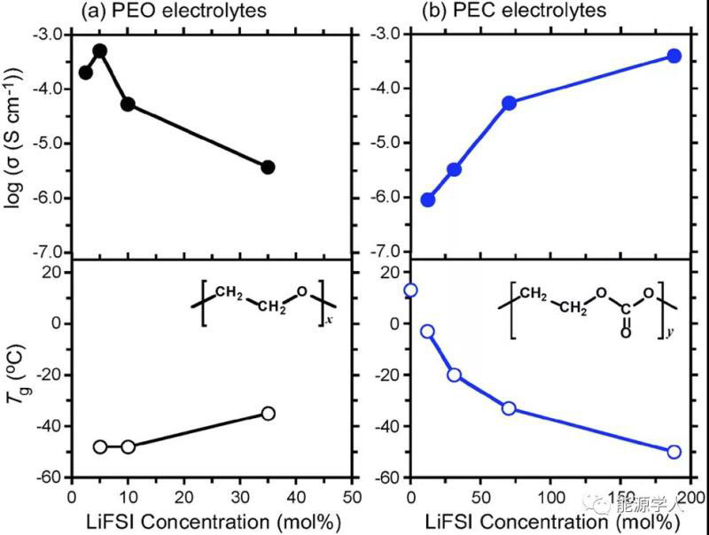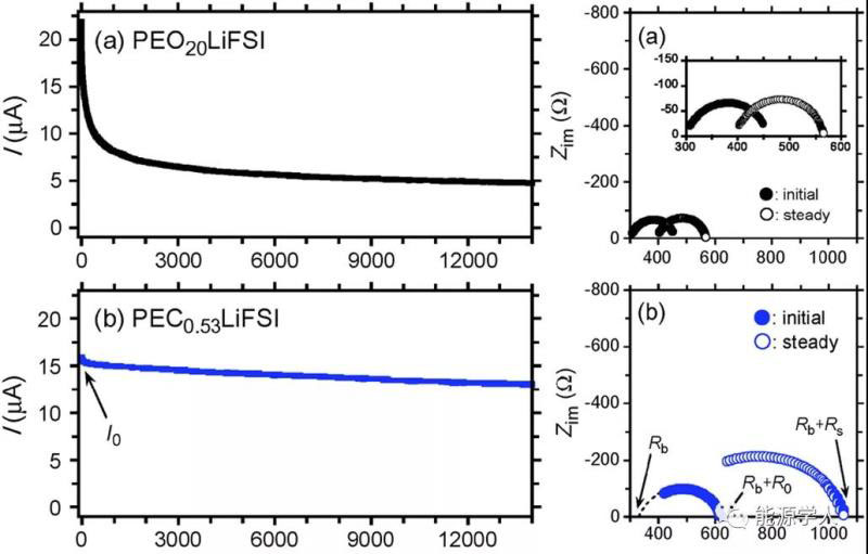 圖3 PEO基SPE與PEC基SPE的鋰離子遷移數(shù)對比圖。