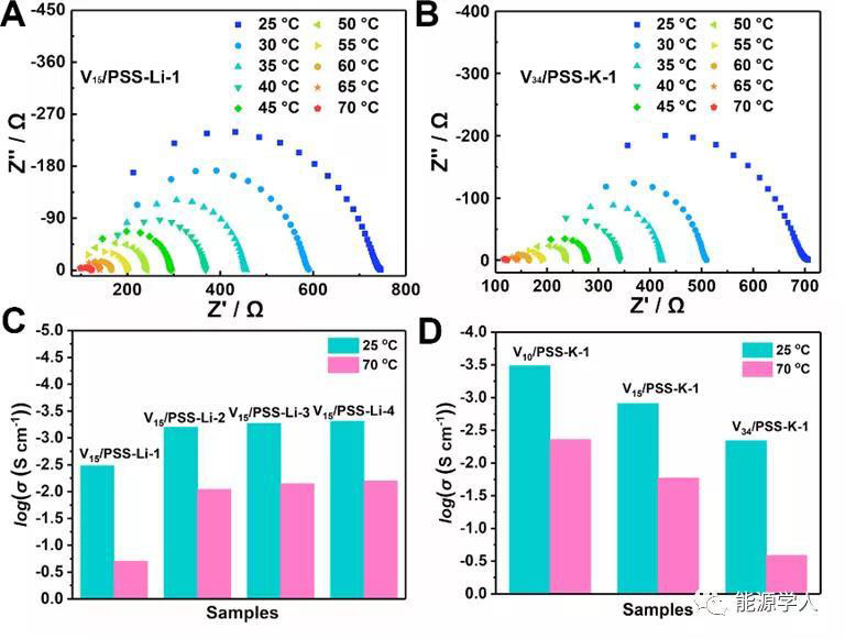 POVs/PSS具有整齊排列的納米線形貌、充足的抗衡陽離子以及高的熱穩(wěn)定性,基于此,其有望作為優(yōu)良的Li+、Na+和K+導(dǎo)體。為了證明這一假設(shè),在氬氣下對這些樣品進(jìn)行了電化學(xué)阻抗(EIS)測試。從圖中可以看出V15/PSS-Li-1和V34/PSS-K-1的奈奎斯特圖由單個微凹半圓組成(圖3A和3B)。以V15/PSS-Li-1為例,隨著Li7V15負(fù)載量的增加(從74.9增加到84.1wt%),其形貌也由隨機(jī)的短納米棒向整齊排列的納米棒變化。并且,V15/PSS-Li-1相比于其他Li7V15負(fù)載量的樣品表現(xiàn)出最好的鋰離子導(dǎo)電性能(圖3C)。