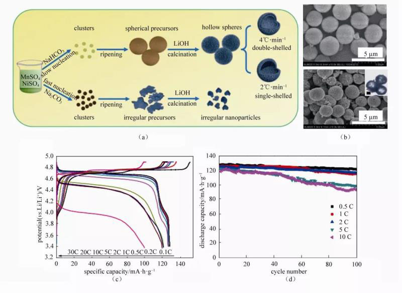 圖6 (a)調(diào)控制備空心球狀介尺度結(jié)構(gòu)鎳錳酸鋰正極材料過程示意圖;(b)碳酸鹽前驅(qū)(上)和鎳錳酸鋰正極材料FESEM照片(下),插圖為相應(yīng)TEM照片,標(biāo)尺1 μm;(c)鎳錳酸鋰在不同倍率下的充放電性能曲線;(d)鎳錳酸鋰在不同倍率下的循環(huán)性能圖