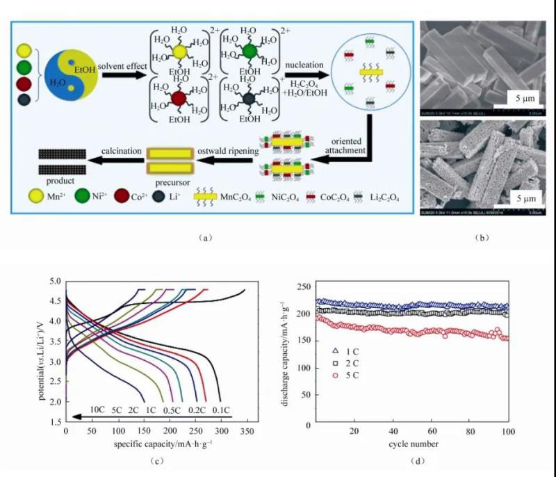 本課題組采用乙醇-水混合溶劑體系共沉淀法,在乙醇和水混合溶劑中,通過控制多元金屬離子草酸鹽共沉淀反應(yīng)的動(dòng)力學(xué)成核和生長(zhǎng)過程,合成了一系列均勻的一維介尺度結(jié)構(gòu)錳基鋰離子電極材料,包括富鋰錳基正極材料0.5Li2MnO3·0.5LiNi1/3 Co1/3Mn1/3O2,顯示了該方法的通用性。并且通過改變乙醇和水的比例可以實(shí)現(xiàn)調(diào)控材料的長(zhǎng)徑比,所合成的電極材料具有優(yōu)異的電化學(xué)性能(圖4)。所制備的一維介尺度結(jié)構(gòu)富鋰錳基正極材料在0.1 C首次放電容量為297.1 mA·h/g,首次庫侖效率為86.4%,在1 C倍率下首次放電容量為221.9 mA·h/g,經(jīng)過100次充放電循環(huán)后,放電容量為211.4 mA·h/g,其容量保持率為95%,10 C電流密度下放電依然具有160.3 mA·h/g的放電容量,表現(xiàn)出較高的可逆放電比容量和優(yōu)異的循環(huán)性能。