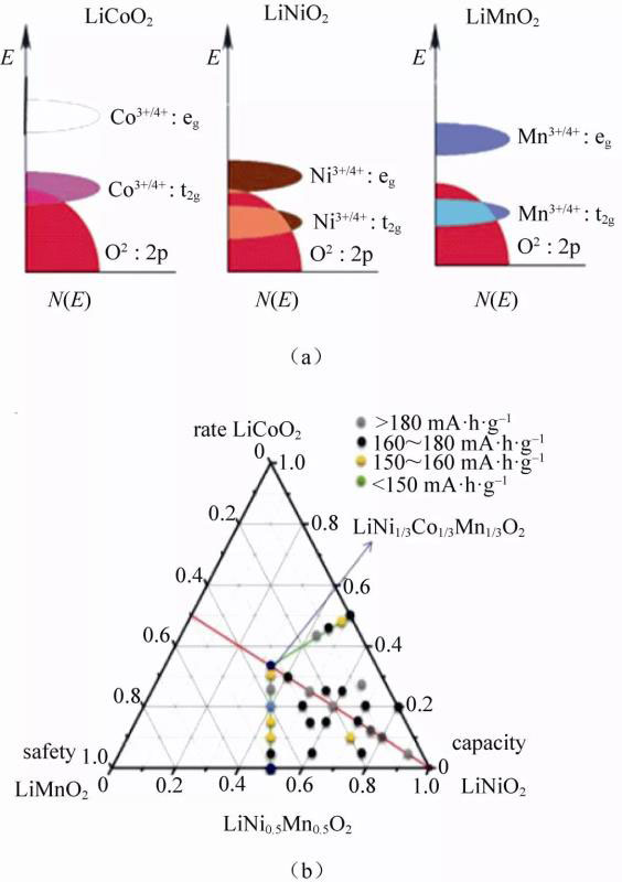 圖1 (a)LiCoO2-LiNiO2-LiMnO2的電子結(jié)構(gòu)示意圖;(b)LiCoO2-LiNiO2-LiMnO2協(xié)同作用示意圖