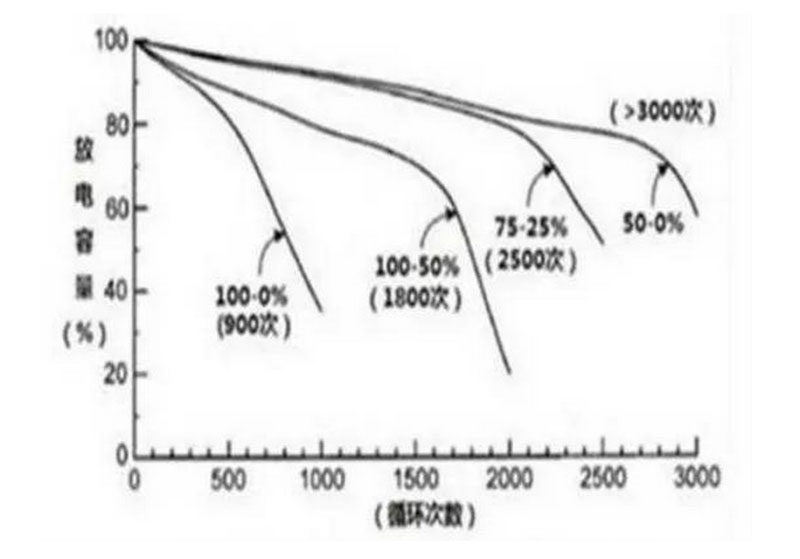 上圖為某三元鋰電池的充放電特性圖,可以看出,不同的充放電方式對(duì)電池的壽命影響不一樣,如上圖數(shù)據(jù),以25%-75%充放電的壽命可以達(dá)到2500次,即我們所說的電池淺充淺放。電池壽命這個(gè)話題我們以后還會(huì)深入討論。