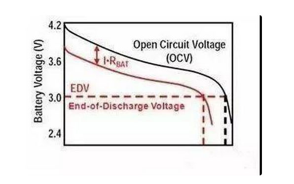 用數(shù)據(jù)說話,下圖表示一電池放電曲線,X軸表示放電量,Y軸表示電池開路電壓,電池理想放電狀態(tài)為黑色曲線,紅色曲線是考慮到電池內(nèi)阻時(shí)的真實(shí)狀態(tài)。