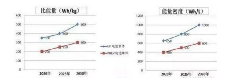 根據(jù)2016年發(fā)布的“節(jié)能與新能源汽車技術(shù),可以大概對(duì)動(dòng)力電池發(fā)展趨勢(shì)有一個(gè)概念,如上圖所示,到2020年,純電動(dòng)汽車電池單體比能量要達(dá)到350Wh/kg。