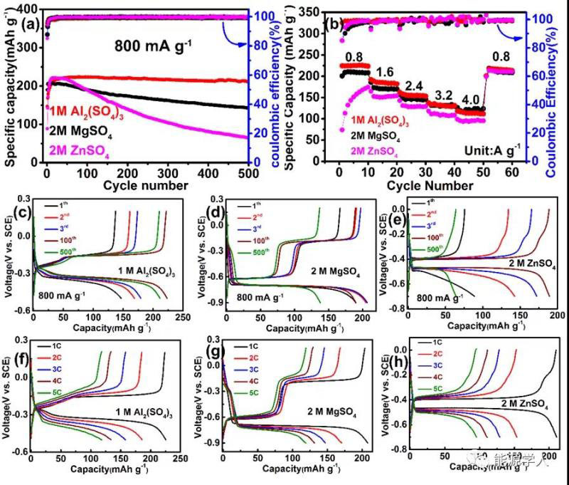 圖5. AQ負(fù)極在水系鋅離子,鎂離子和鋁離子電池中的電化學(xué)性能。