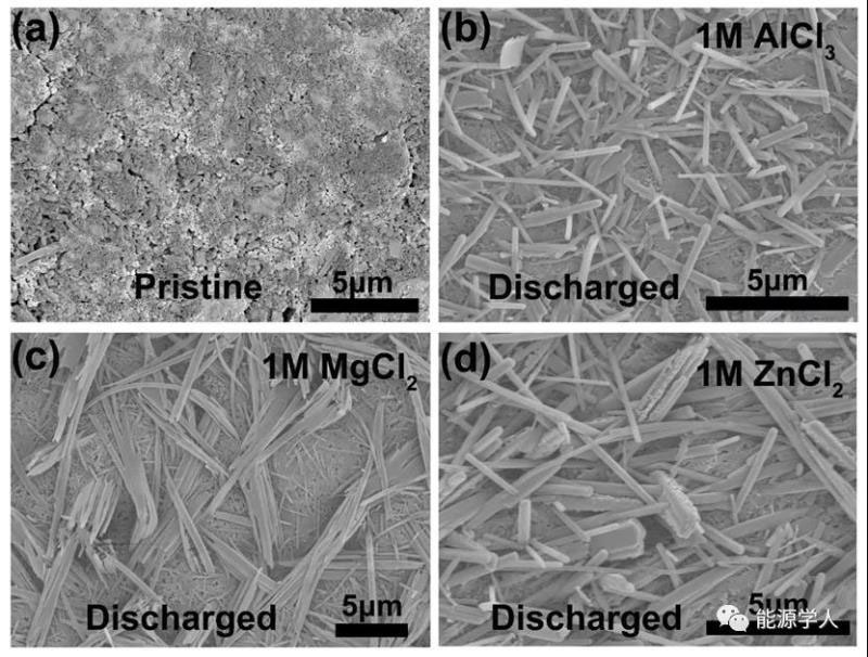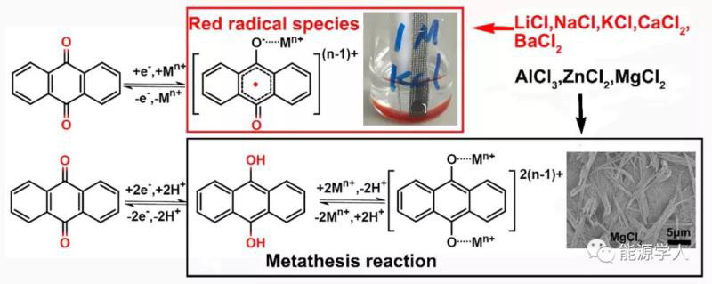 進(jìn)一步地,研究者利用掃描電子顯微鏡觀察了AQ電極循環(huán)前,第一次還原后的電極形貌,如圖3所示。相比于循環(huán)前平整的電極表面,在不同電解液中經(jīng)過(guò)第一次還原之后的電極表面出現(xiàn)了很多棒狀物質(zhì),這表明了有物質(zhì)在電極表面成核和生長(zhǎng)。結(jié)合還原電勢(shì)的推斷,研究者提出了質(zhì)子輔助金屬離子置換反應(yīng)機(jī)理,AQ獲得兩電子與質(zhì)子耦合生成AQ-H2,而AQ-H2在水中溶解度要高于AQ,因此有部分AQ-H2從電極內(nèi)部溶出到電極表面,與金屬離子發(fā)生置換生成AQ-M,M為Al, Zn, Mg。AQ-M在電極表面成核和生長(zhǎng)為棒狀新相。反應(yīng)機(jī)理如圖4所示。