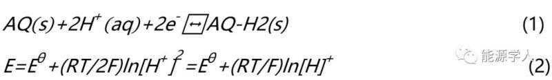 那為什么在1M HCl,AlCl3,ZnCl2和MgCl2電解液中沒(méi)出現(xiàn)紅色物質(zhì)呢?圖1f中AQ電極在1M HCl中的CV曲線表明了AQ經(jīng)歷了單步雙電子反應(yīng)生成蒽二酚(AQ-H2), 如反應(yīng)方程式1所示。而根據(jù)Nernst方程2,該反應(yīng)的熱力學(xué)平衡電位與質(zhì)子濃度密切相關(guān),質(zhì)子濃度越高,電位越正。這與AQ電極在1M AlCl3,ZnCl2和MgCl2電解液中觀察到的還原電勢(shì)趨勢(shì)一致,加上他們之間的還原峰型相似,因此我們推斷質(zhì)子在還原過(guò)程中參與了反應(yīng),決定了還原電勢(shì)的大小。