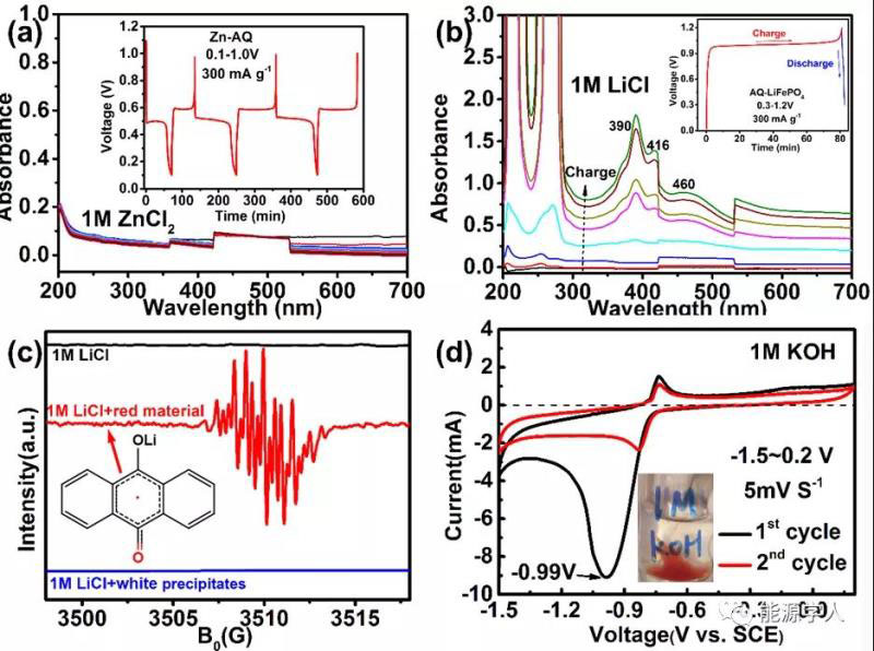 圖2. (a) Zn-AQ電池,(b) AQ-LiFePO4電池的原位紫外可見(jiàn)光光譜,(c)紅色物質(zhì)的電子自旋共振譜,(d) AQ電極在1MKOH溶液中的CV曲線。