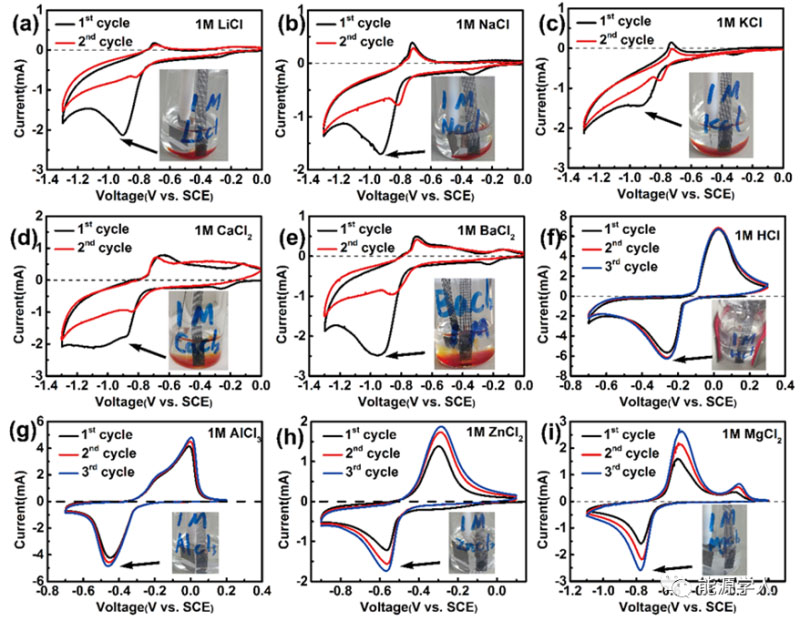 AQ是一類典型的醌類化合物,大量應(yīng)用于染料中間體,雙氧水制備和造紙等工業(yè)中。AQ為黃色結(jié)晶粉末,在水中溶解度很?。?0℃下為5mg L-1),可以實(shí)現(xiàn)兩電子轉(zhuǎn)移,理論比容量為257 mAhg-1。研究者測(cè)試了AQ電極在不同水溶液電解液的循環(huán)伏安曲線(CV)。如圖1所示,出現(xiàn)了非常有意思的反應(yīng)現(xiàn)象。在1M LiCl, NaCl, KCl, CaCl2和BaCl2電解液中,AQ電極在第一圈還原過(guò)程中,產(chǎn)生了大量紅色物質(zhì),并脫離電極溶入電解液中,導(dǎo)致電極反應(yīng)不可逆,但反應(yīng)的還原電勢(shì)比較接近,在-0.9到-1.0V(vs. SCE)之間;而在1M HCl, AlCl3, ZnCl2和MgCl2電解液中,AQ電極反應(yīng)可逆,溶液也一直保持澄清,但還原電勢(shì)各不相同,總體趨勢(shì)是溶液pH越小,還原電勢(shì)越高。以上現(xiàn)象表明不同的水溶液電解液對(duì)AQ的氧化還原性質(zhì)有著顯著的影響。
