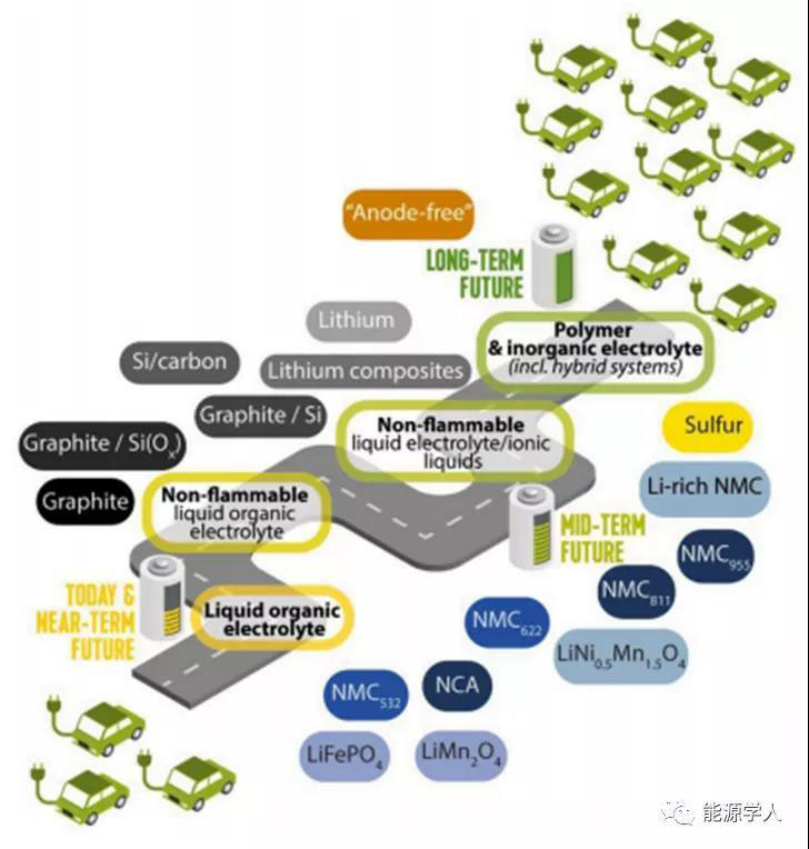 圖5. 電動(dòng)汽車電池研發(fā)工作的總體路線圖,涉及使用的陽(yáng)極,電解質(zhì)和陰極材料