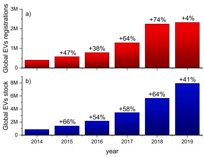 在美國(guó),中國(guó)和日本也提出了相應(yīng)的激勵(lì)措施。這些框架計(jì)劃無(wú)疑為增加全球電動(dòng)汽車注冊(cè)量(如圖3a)和累計(jì)銷量(如圖3b)做出了貢獻(xiàn),兩者均顯示出了驚人的增長(zhǎng)率。需要指出的是,盡管2019年中國(guó)和美國(guó)對(duì)電動(dòng)汽車的財(cái)政支持減少了,因此導(dǎo)致了全球范圍內(nèi)新電動(dòng)汽車較低的注冊(cè)增長(zhǎng)率(+4%),但這些國(guó)家的銷量無(wú)論如何都接近了之前的水平。而在歐洲的銷售額進(jìn)一步增加(數(shù)據(jù)來(lái)源:ZSW Data ServiceRenewable Energies)。