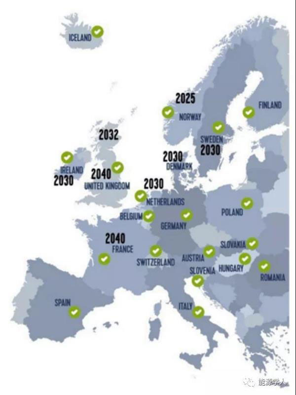 圖2. 計(jì)劃禁止(純粹)以汽油為動(dòng)力的汽車進(jìn)行注冊(cè)(以年為單位)以及購(gòu)買電動(dòng)汽車具有補(bǔ)貼的歐洲國(guó)家/地區(qū)總體概覽(以綠色“對(duì)號(hào)√”表示)