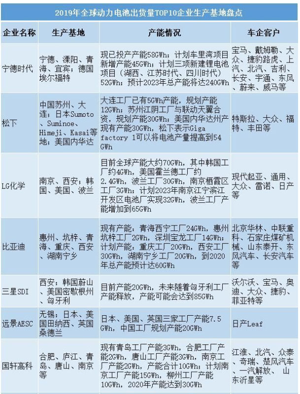 電池網(wǎng)匯總2019年全球鋰動(dòng)力電池出貨量TOP10企業(yè)的生產(chǎn)基地、產(chǎn)能及主要客戶等情況發(fā)現(xiàn):近年來,寧德時(shí)代、松下和LG化學(xué)等頭部企業(yè)除了市占率進(jìn)一步提升之外,產(chǎn)能擴(kuò)產(chǎn)的步伐也在提速,且海外市場(chǎng)的布局力度也在加大:LG化學(xué)、三星SDI、寧德時(shí)代等全球主要的動(dòng)力電池企業(yè)已開始在歐洲設(shè)立生產(chǎn)基地。